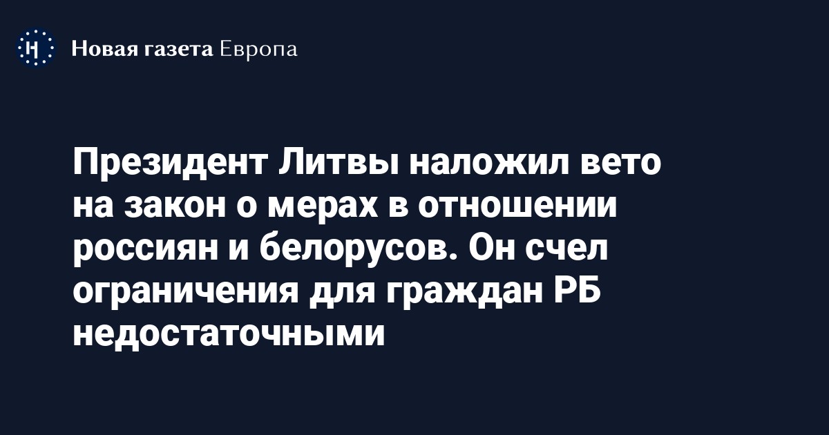 Науседа предложил парламенту ввести одинаковые ограничения как для россиян, так и для белорусов. Принятый закон вводит семь различных ограничительных мер, четыре из которых распространяются на граждан как России, так и Беларуси, а три — только на граждан России.