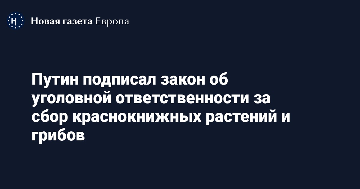 Президент России Владимир Путин подписал закон об уголовной отвественности за сбор краснокнижных растений и грибов. Соответствующий документ опубликован на официальном портале правовой информации.