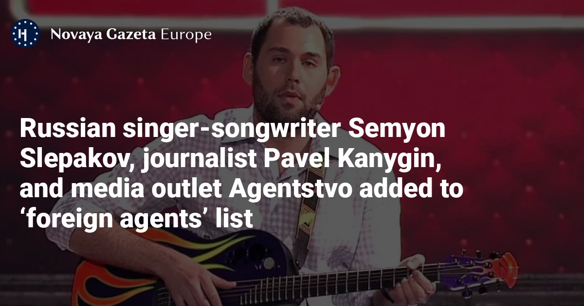 Russian singer-songwriter Semyon Slepakov, journalist Pavel Kanygin, and media outlet Agentstvo have been added to the “foreign agents” list by Russia’s Ministry of Justice, as per the ministry’s website.