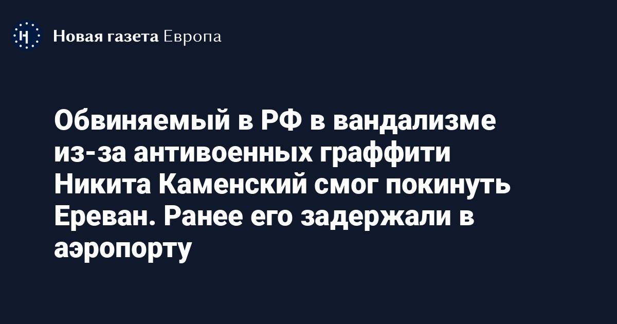 Никита Каменский, обвиняемый в РФ в вандализме из-за антивоенных граффити, покинул Армению, где его задержали ранее. Он сообщил «ОВД-Инфо», что сейчас находится в безопасности.