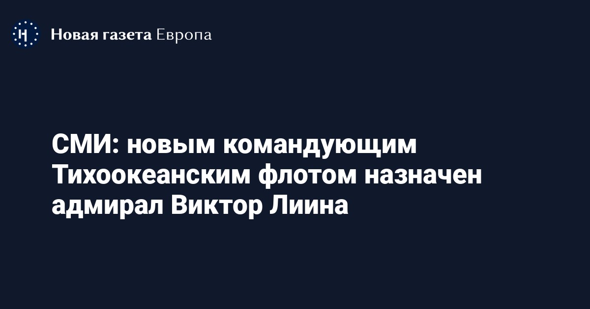 Новым командующим Тихоокеанским флотом (ТОФ) России назначен адмирал Виктор Лиина, ранее занимавший должность командующего Балтийским флотом ВМФ. Об этом сообщают ТАСС и РИА Новости со ссылкой на источники.