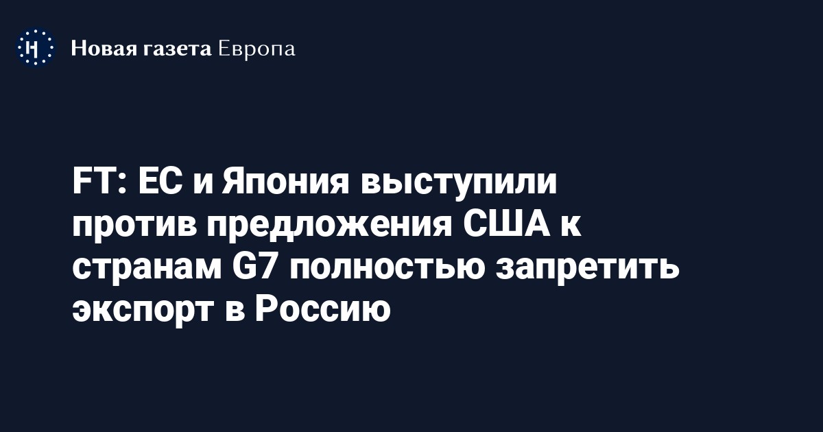 ЕС и Япония выступили против предложения США к странам «Большой семерки» полностью запретить экспорт в Россию, пишет Financial Times со ссылкой на три источника.