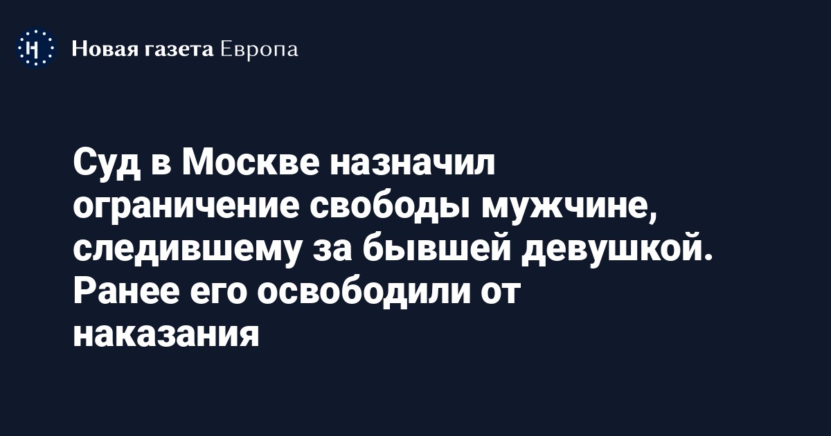 Мосгорсуд назначил ограничение свободы на один год и восемь месяцев Ивану Матвееву, который более двух лет после расставания преследовал бывшую девушку Елену Самохину. Об этом сообщает «Консорциум женских неправительственных объединений».