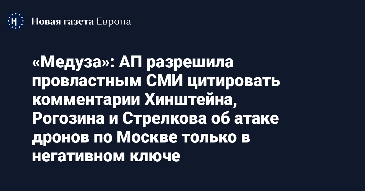 Администрация президента составила для СМИ список рекомендаций по освещению атаки дронов по Москве, в которых говорится, что комментарии депутата Александра Хинштейна, сына Дмитрия Рогозина Александра и «экс-главы Минобороны» «ДНР» Игоря Стрелкова можно использовать только с негативной окраской. Об этом сообщает «Медуза» со ссылки на источники в провластных изданиях.