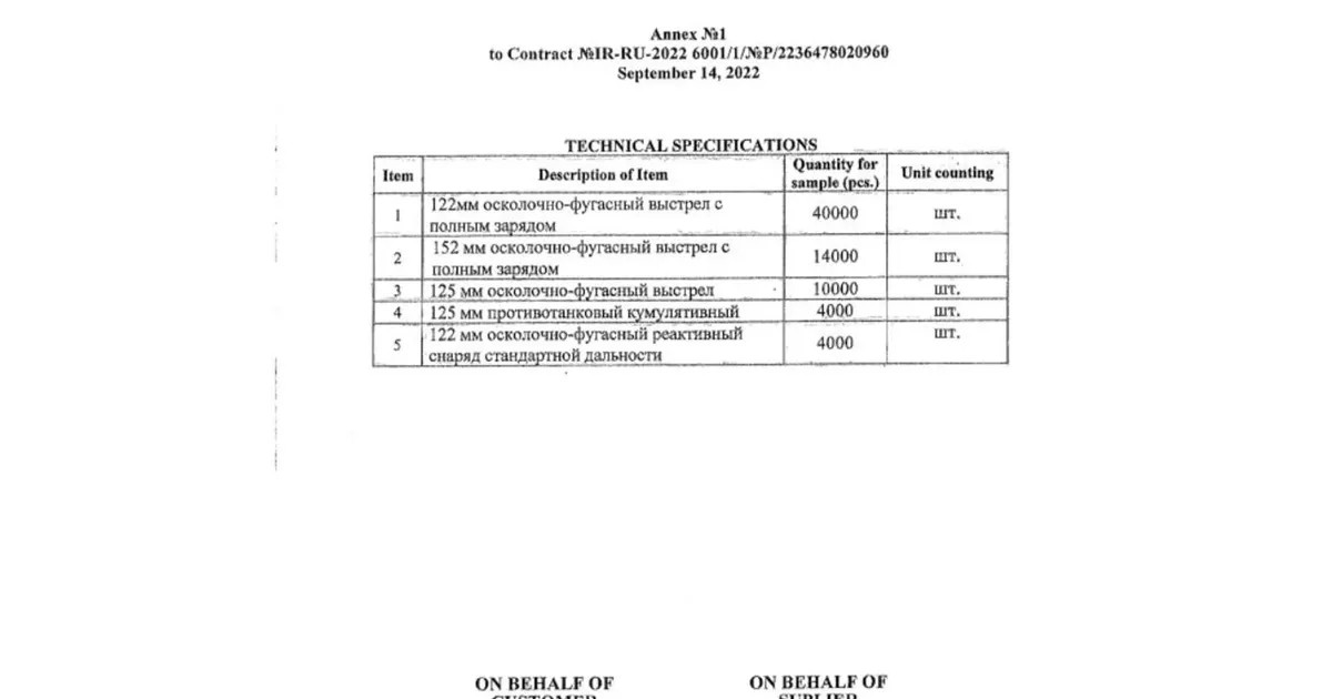 В документе — 16 страниц. Он датирован 14 сентября 2022 года. «Он, по-видимому, предназначен для образцов различных размеров артиллерийских и танковых снарядов и ракет», — пишут журналисты.