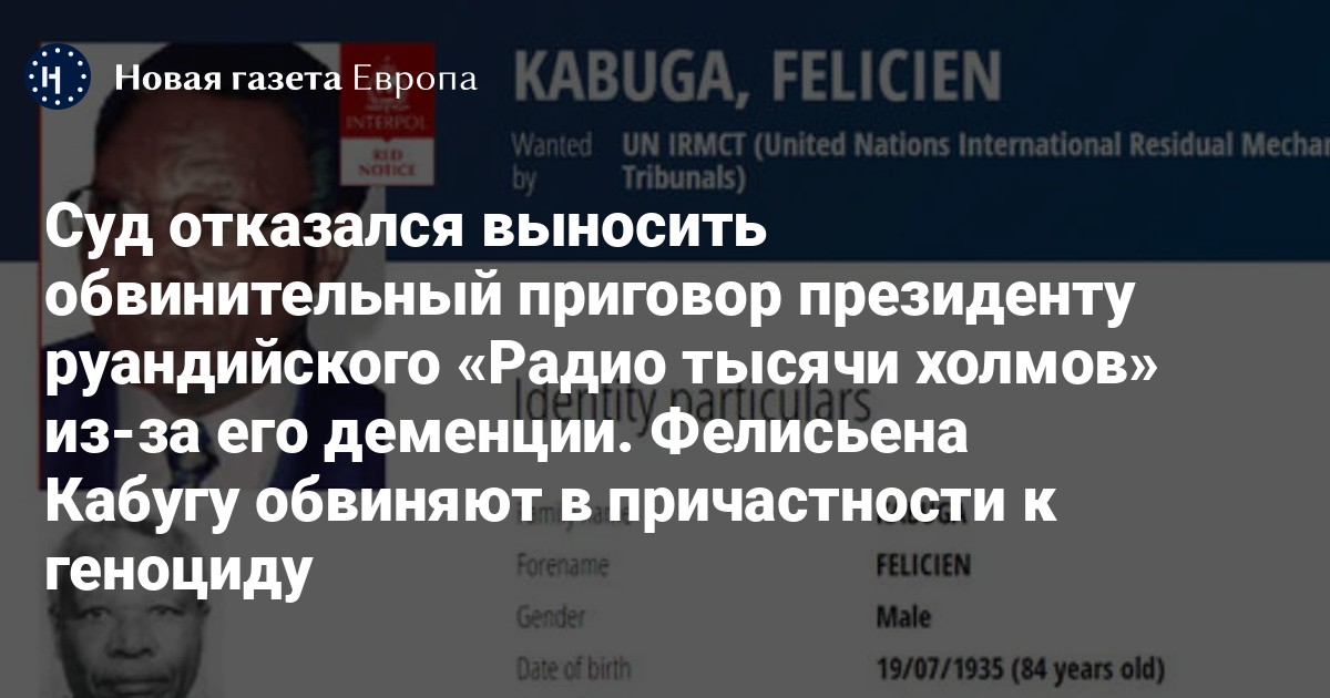 Международный остаточный механизм для уголовных трибуналов (МОМУТ) отказался выносить обвинительный приговор сооснователю и финансисту руандийского «Радио тысячи холмов» Фелисьену Кабуге. Об этом говорится в решении суда.