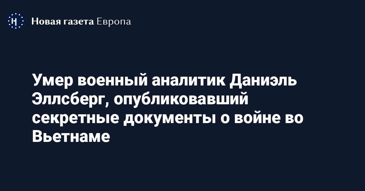 В возрасте 92 лет умер бывший военный аналитик Даниэль Эллсберг, опубликовавший «Документы Пентагона» — секретные материалы о войне во Вьетнаме. О смерти аналитика сообщил его сын Роберт Эллсберг.