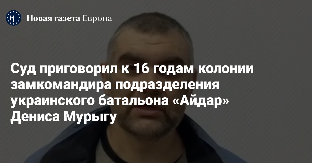 Южный окружной военный суд приговорил заместителя командира одного из подразделений украинского батальона «Айдар» Дениса Мурыгу к 16 годам колонии строгого режима. Об этом сообщает ТАСС.