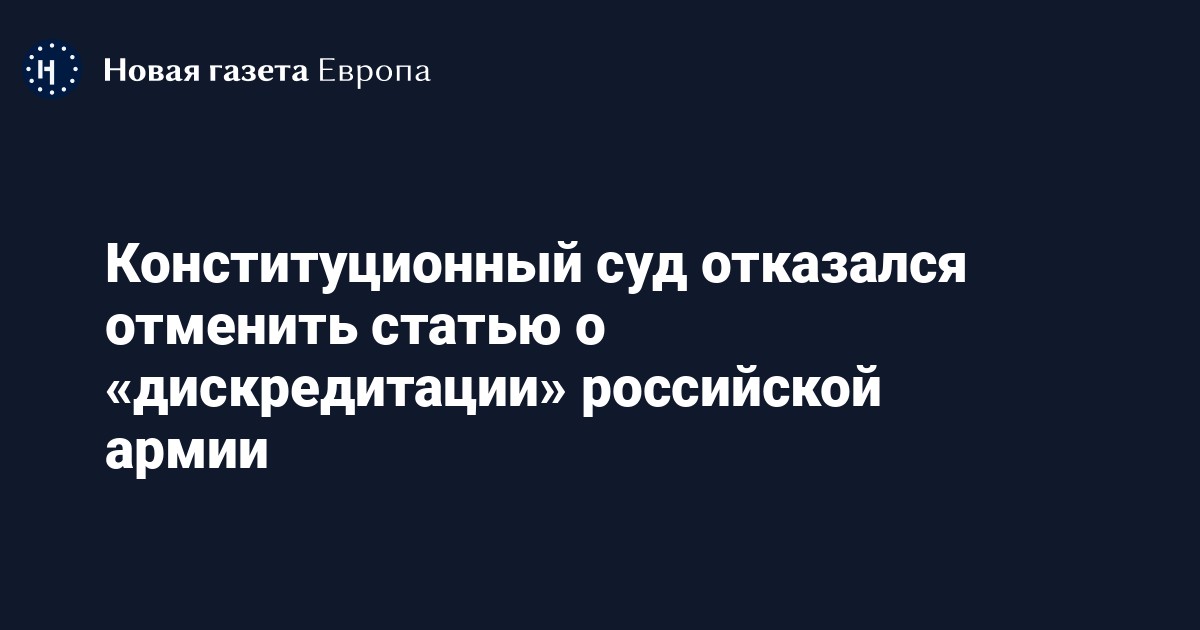 Конституционный суд отказался рассмотреть жалобы 13 заявителей, которые попросили признать неконституционной и отменить административную статью о «дискредитации» российской армии (ст. 20.3.3 КоАП). На определения суда обратило внимание «ОВД-Инфо».