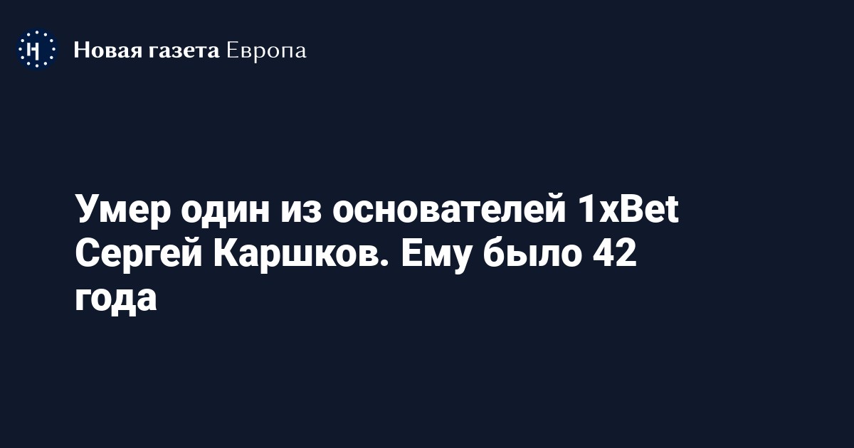 В возрасте 42 лет умер один из создателей букмекера 1xBet Сергей Каршков, сообщил генеральный продюсер анимационной студии Toonbox Павел Мунтян.