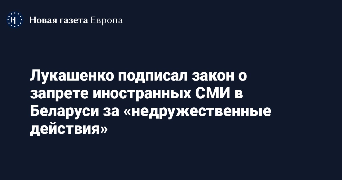 Александр Лукашенко подписал закон о запрете иностранных СМИ в Беларуси в случае проявления другими странами «недружественных действий» в отношении белорусских СМИ.