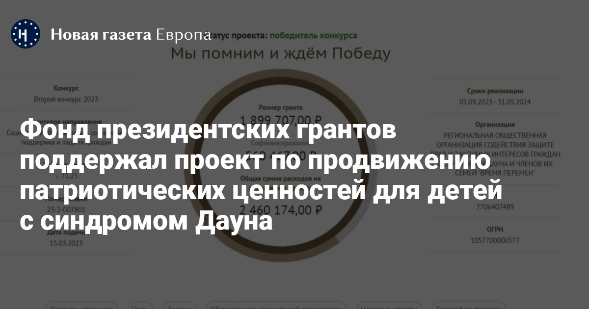 Фонд президентских грантов поддержал проект общей суммой почти в 2,5 млн рублей по продвижению патриотических ценностей для детей с синдромом Дауна. Об этом сообщается на сайте фонда.