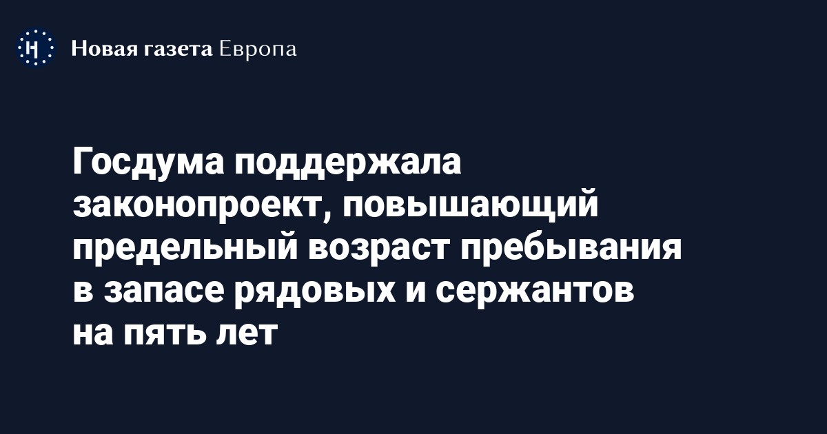 Также законопроект повышает возраст пребывания запасников в мобилизационном резерве ВС РФ. Для старших офицеров — с 60 до 65 лет, для младших офицеров — с 55 до 60 лет, иные звания — с 45 до 55. Предельный возраст для высших офицеров остается без изменений (70 лет).
