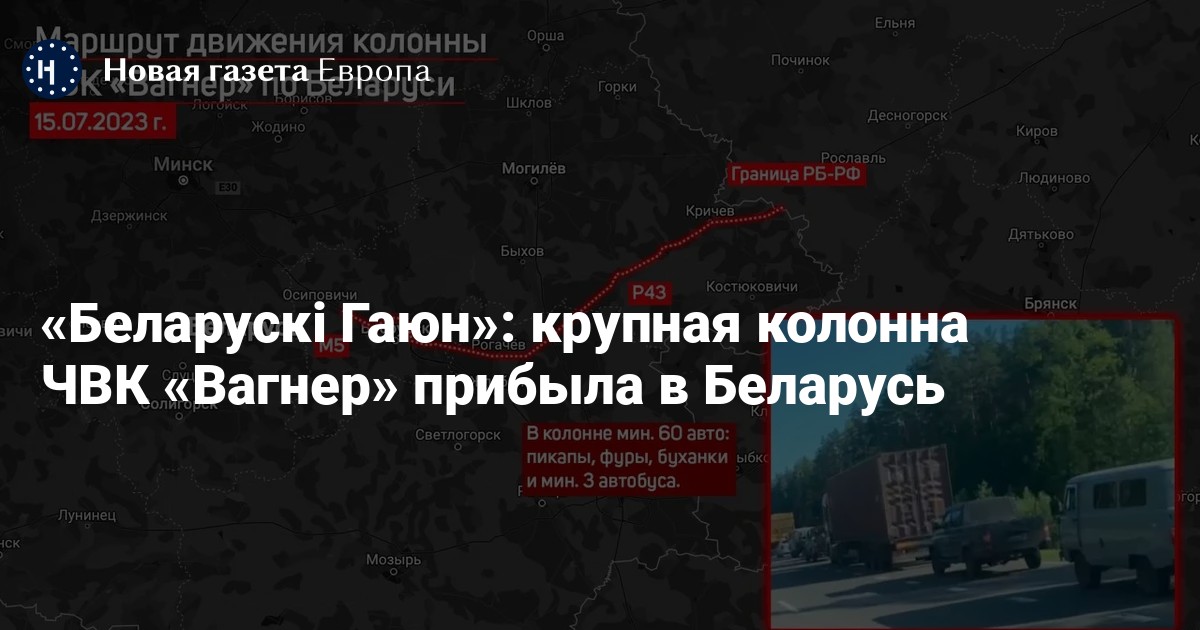 Колонна ЧВК «Вагнер», состоящая, по меньшей мере, из 60 автомобилей, прибыла в Беларусь. Об этом сообщает белорусский проект «Беларускі Гаюн», занимающийся мониторингом военной активности.