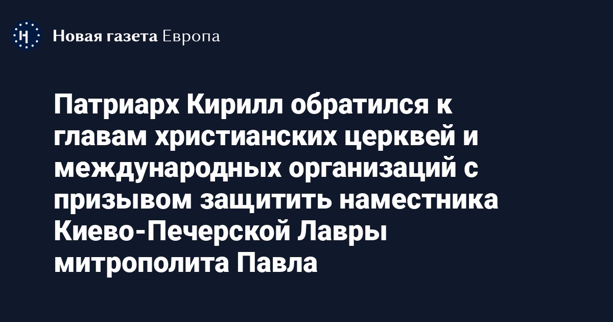 Патриарх Кирилл призвал представителей христианских церквей, а также генсеков ООН, ОБСЕ и Совета Европы принять меры для защиты взятого под стражу наместника Киево-Печерской лавры митрополита Павла. Об этом сообщается на сайте Московского патриархата.