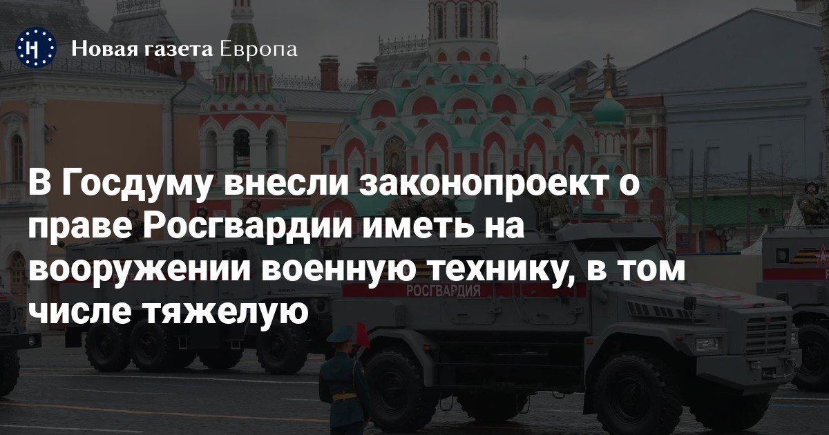 В Госдуму внесли законопроект, который наделяет Росгвардию правом иметь на вооружении военную, в том числе тяжелую, технику. Документы опубликованы на сайте нижней палаты парламента.
