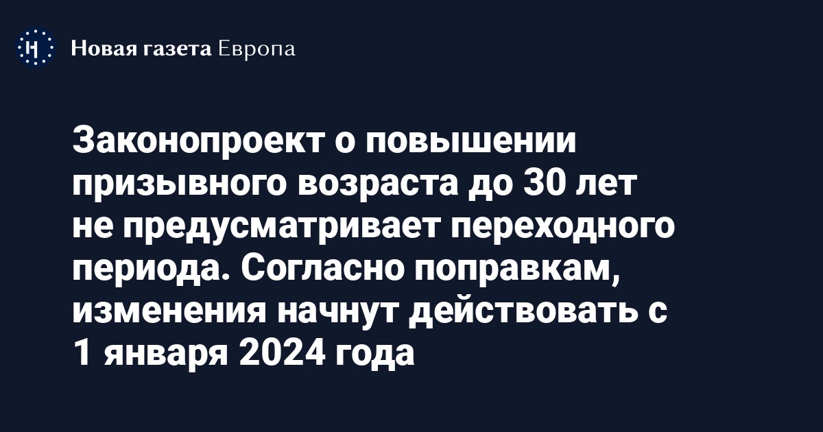 В базе законодательной деятельности Госдумы опубликовали соответствующий документ. В нем предлагается повысить призывной возраст до 30 лет с 1 января 2024 года, а нижнюю планку — возраст с 18 лет — оставить прежней.