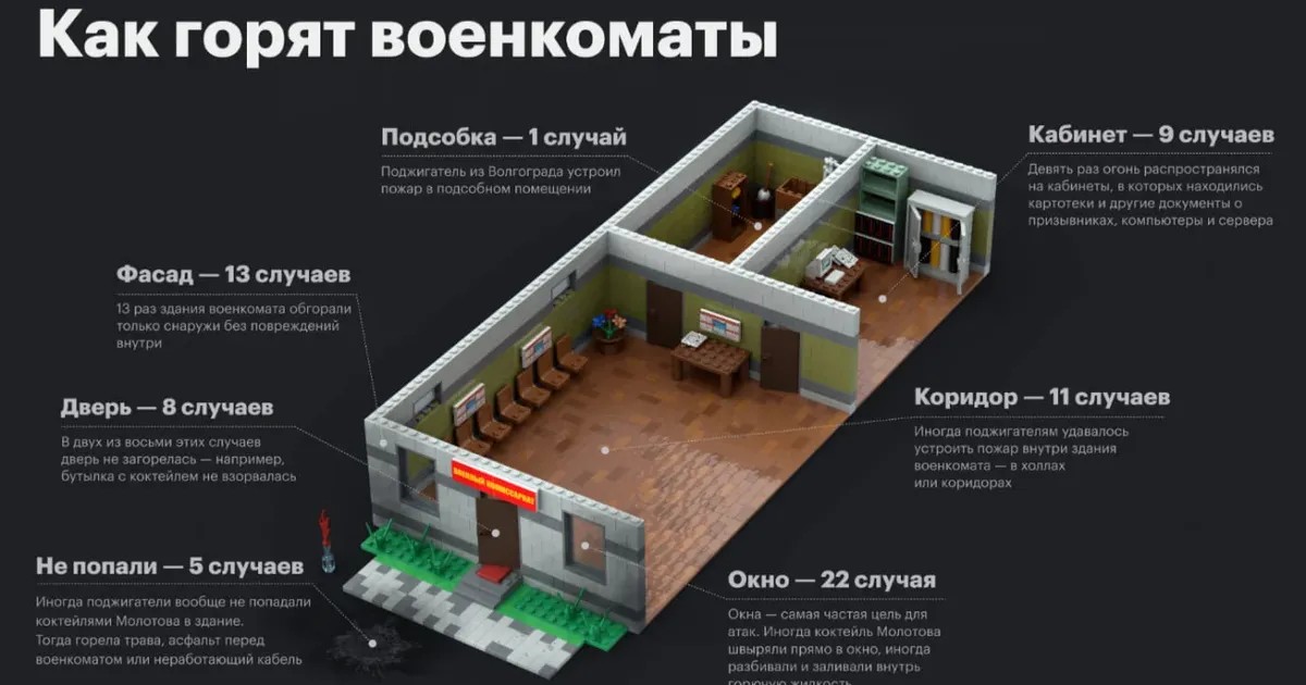 Как пишет издание, на сегодняшний день известно о 113 случаях поджогов военкоматов по всей стране. Статьи, по которым расследуются дела, известны в 84 делах. Из них половина — 40 поджогов — расследуются по статьям о терроризме. На втором месте — 28 случаев — квалифицировали как уничтожение имущества, еще девять поджогов сочли хулиганством.