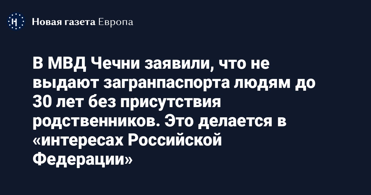 В МВД России по Чеченской республике объяснили, почему люди младше 30 лет должны получать загранпаспорта в присутствии родителей или других старших родственников. О причинах говорится в ответе МВД на жалобу адвоката Александра Немова, его приводит кризисная группа «СК SOS».