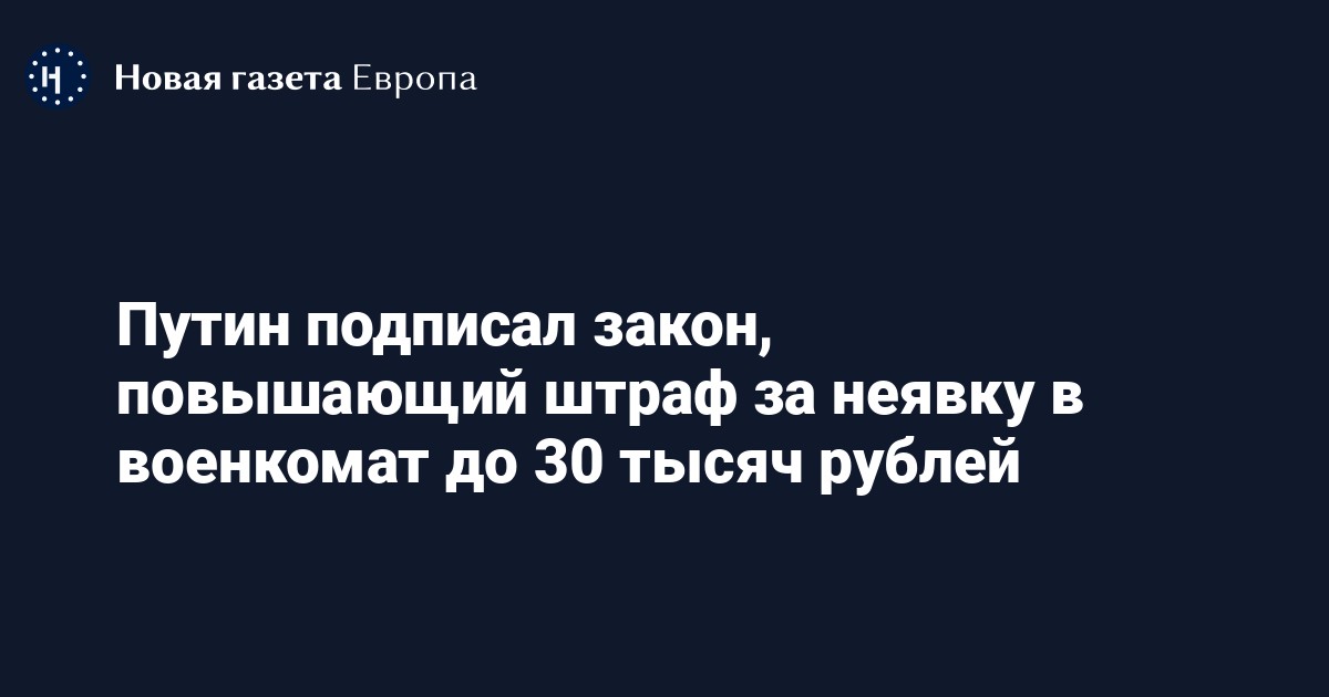 Президент России Владимир Путин подписал закон, повышающий штраф за неявку в военкомат по повестке без уважительной причины до 30 тысяч рублей. Соответствующий документ опубликован на официальном портале правовой информации.