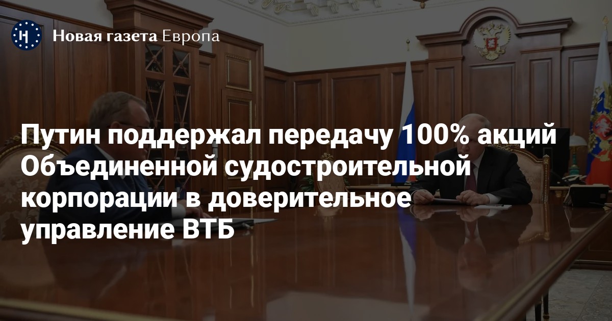 «Правительство Российской Федерации проработало вопрос и вышло с предложением передать ВТБ государственный пакет акций Объединенной судостроительной корпорации. Я поддерживаю это предложение», — сказал Путин.