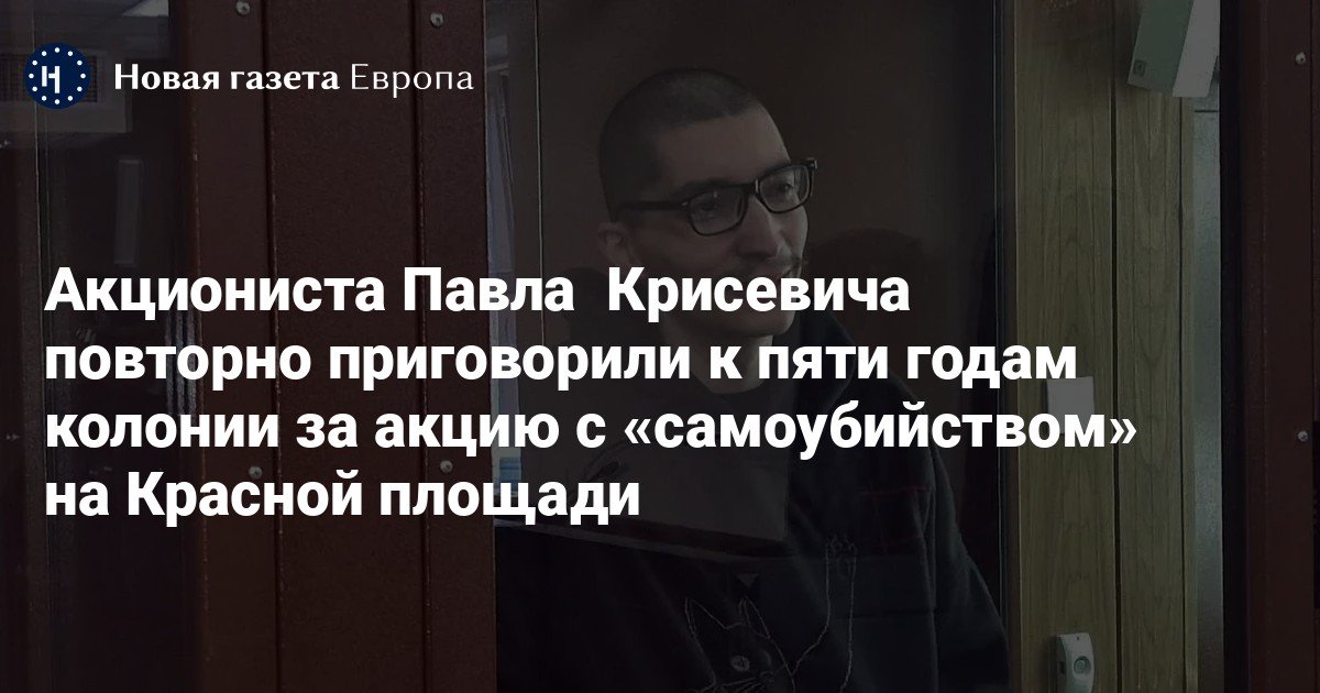 Тверской районный суд Москвы повторно приговорил художника и акциониста Павла Крисевича к пяти годам колонии по статье о хулиганстве с применением оружия (ч. 2 ст. 213 УК РФ) за акцию на Красной площади в Москве. Об этом сообщает корреспондент «Новой-Европа» из здания суда.