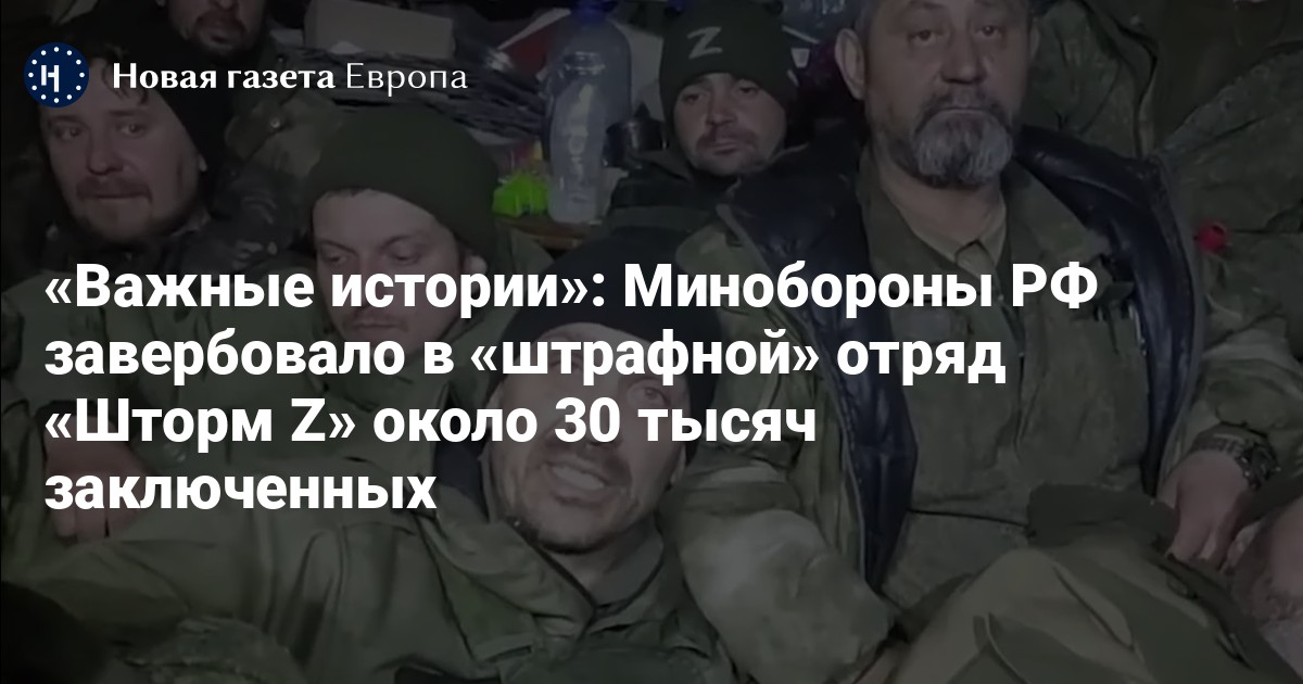 Минобороны РФ в 2023 завербовало в «штрафной» отряд «Шторм Z», участвующий в войне в Украине, до 30 тысяч заключенных. Об этом говорится в исследовании «Важных историй».