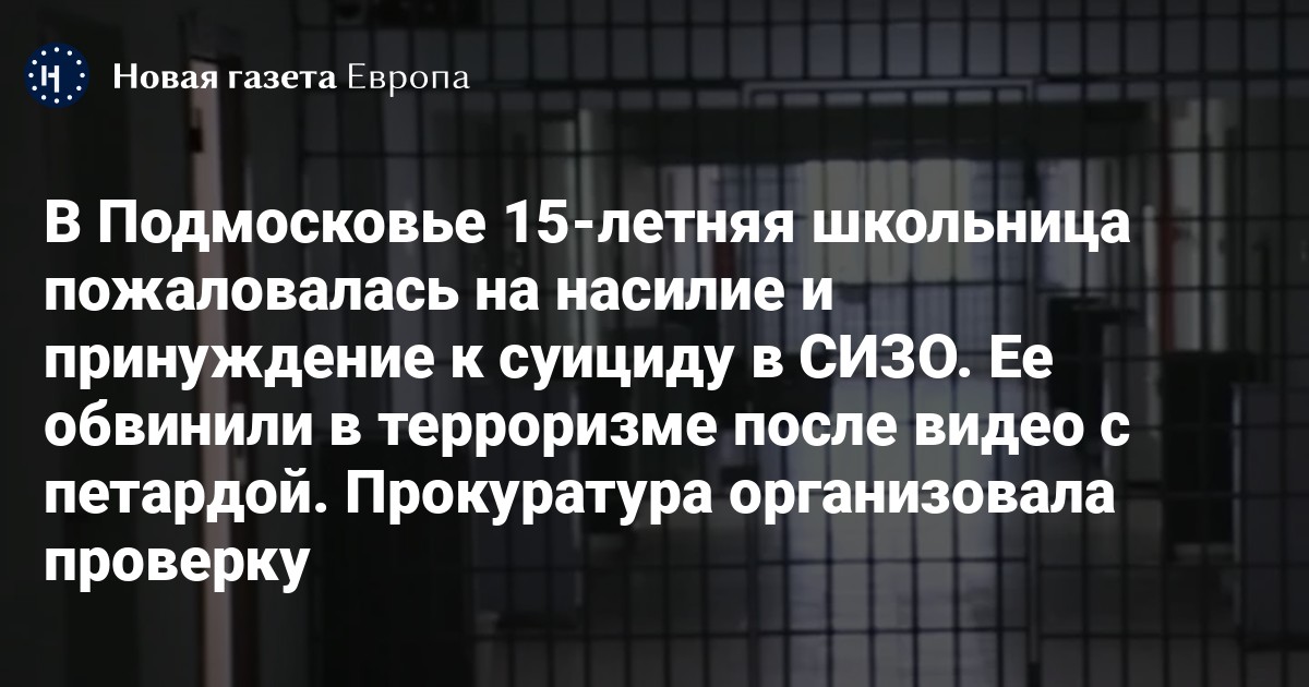 Дмитровская городская прокуратура проверит заявления 15-летней школьницы из Балашихи об избиении, издевательствах и сексуализированном насилии в СИЗО, где она находилась по обвинению в пропаганде терроризма (ст. 205.2 УК) и участии в террористическом сообществе (ст. 205.5 УК). Об этом сообщила член Совета по правам человека при президенте РФ (СПЧ) Ева Меркачева в статье для «Московского комсомольца».