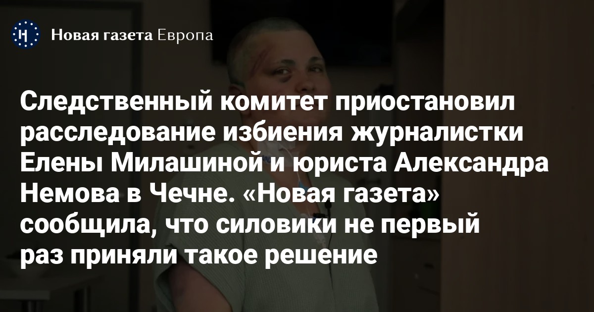 Вскоре «Новая газета» заявила, что силовики не первый раз «приостановили» расследование избиения Елены Милашиной и адвоката Александра Немова в Чечне. По информации издания, все предыдущие решения о приостановке отменяло само руководство чеченского СУСКа, и расследование формально возобновлялось, а через несколько месяцев снова приостанавливалось.