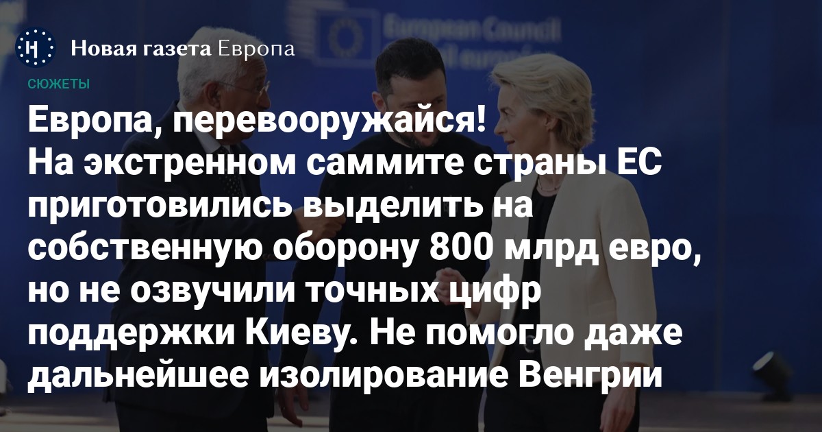 Однако поддержавший своих коллег в вопросах трат на европейскую оборону премьер Венгрии Виктор Орбан выступил категорически против дальнейшей поддержки Киева и усиления санкционного давления на Москву. В итоге касающиеся Украины тезисы выделили в отдельный документ саммита в Брюсселе, под которым подписались 26 из 27 лидеров стран ЕС.