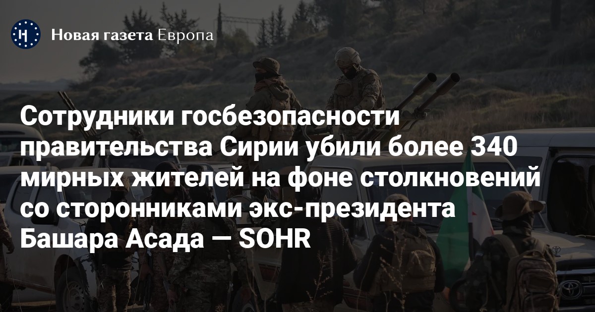 За последние два дня сотрудники госбезопасности нового правительства Сирии убили более 340 мирных жителей. Об этом сообщают AFP и Reuters со ссылкой на Сирийскую обсерваторию по наблюдению за правами человека (SOHR).