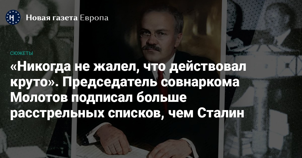 Видимо, сильно напуганный пронесшейся над ним опасностью ареста и последующего расстрела, Молотов активно включается в партийные чистки 30-х годов. Когда появились «сталинские расстрельные списки», в которых члены Политбюро ЦК КПСС ставили свои подписи «за расстрел», на списках подготовленных НКВД, больше всего подписей именно Вячеслава Молотова — 372. Даже у Сталина было меньше — 357.