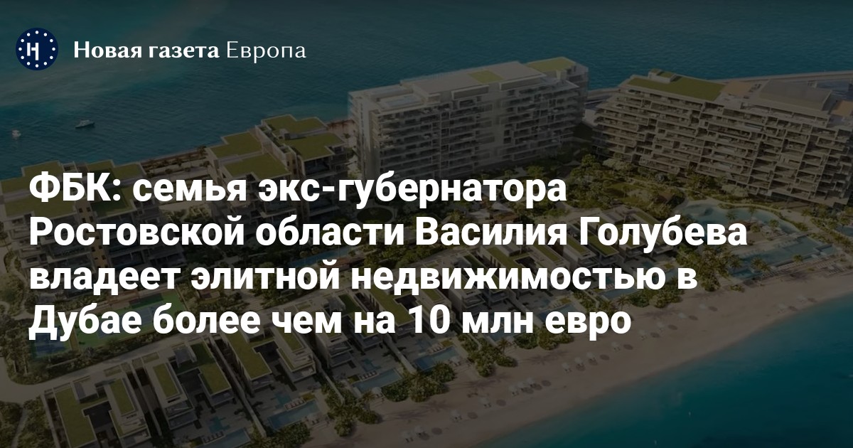 Родственники бывшего губернатора Ростовской области и члена Совета Федерации Василия Голубева владеют элитной недвижимостью в Дубае общей стоимостью 10,5 млн евро (около 1 млрд рублей), выяснил Фонд борьбы с коррупцией (ФБК), проанализировав выписки на недвижимость.