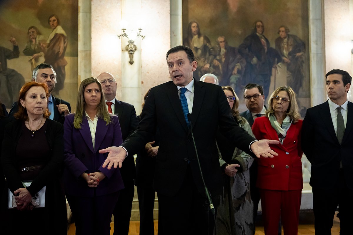 Премьер-министр Португалии Луиш Монтенегро беседует с прессой после отклонения предложения о доверии правительству в парламенте Португалии в Лиссабоне, Португалия, 11 марта 2025 года. Фото: Jose Sena Goulao / EPA-EFE
