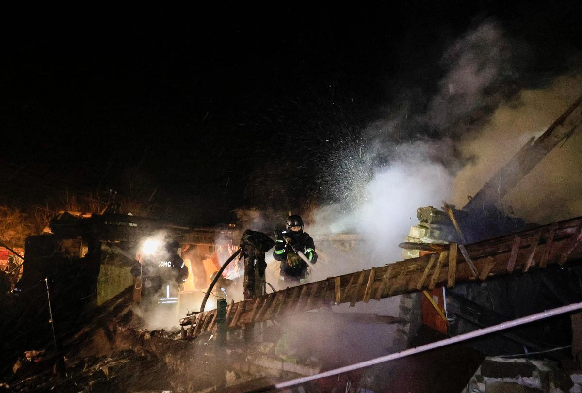 Rescue workers tackle fires at the site of a Russian drone strike on Kharkiv, in eastern Ukraine, 29 March 2025. Photo: EPA-EFE / SERGEY KOZLOV