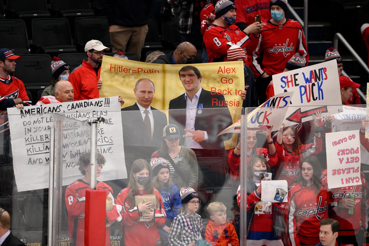 Плакат с изображением Владимира Путина и Александра Овечкина перед матчем НХЛ в Вашингтоне, 5 марта 2022 года. Фото: Nick Wass / AP Photo / Scanpix / LETA