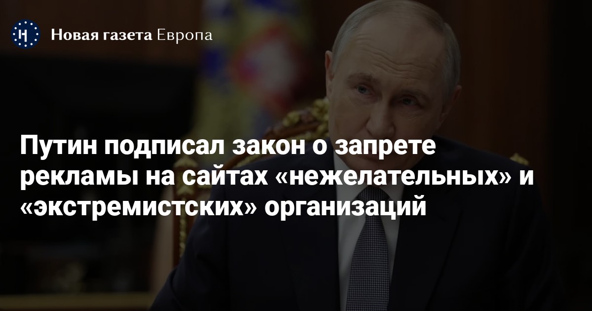 Владимир Путин подписал закон, запрещающий размещать рекламу на сайтах «нежелательных» и «экстремистских» организаций. Соответствующий документ опубликован на официальном портале правовой информации.