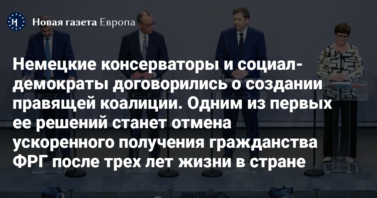 Одним из первых действий коалиция отменит ускоренное получение гражданства Германии после трех лет жизни в стране. Для немецкого паспорта теперь снова будет необходимо будет легально прожить в стране не менее пяти лет. Закон, упрощающий получение гражданства ФРГ, был принят Бундестагом в январе 2024 года.