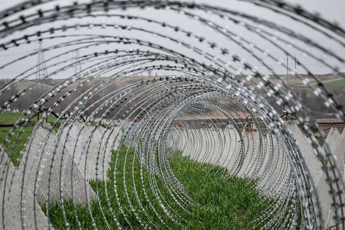 Проволочные заграждения и противотанковые ежи на поле с ячменём в Запорожской области, 17 марта 2025 года. Фото: Dmytro Smolienko / Ukrinform / ZUMA Press Wire / SplashNews.com / Vida Press
