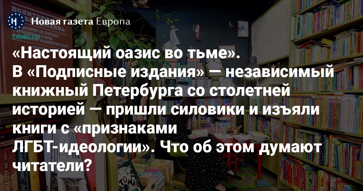 Силовики пришли с проверкой в независимый книжный магазин «Подписные издания» в Петербурге. Они изъяли в магазине несколько десятков книг, в которых нашли «признаки ЛГБТ-идеологии».