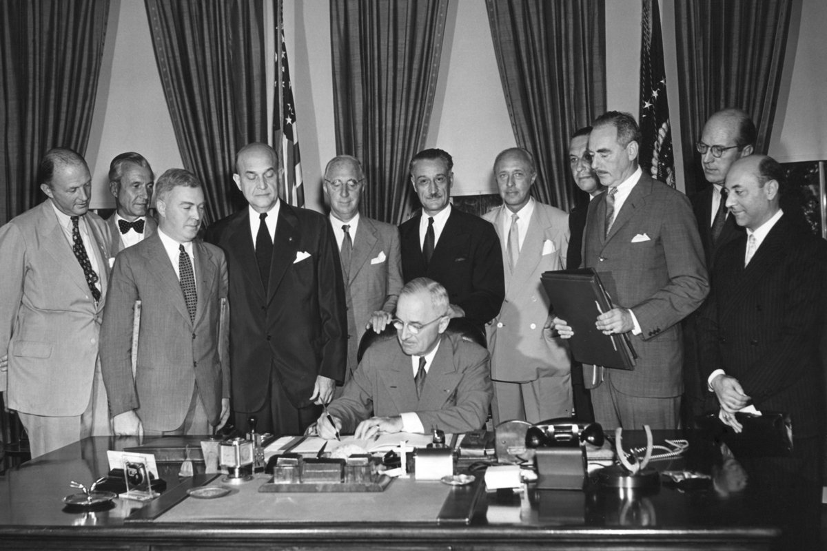Президент США Гарри Трумэн в окружении дипломатов стран-участниц договора и американских официальных лиц подписывает Североатлантический договор, 24 августа 1949 года. Фото: Courtesy Everett Collection / Vida Press
