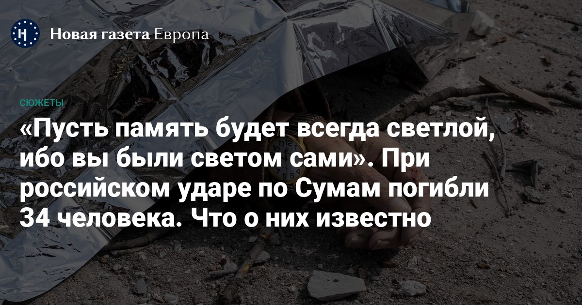 13 апреля Россия запустила две баллистические ракеты по Сумам. В результате ударов, по последним данным, погибли по меньшей мере 34 человека, количество раненых выросло до 119 человек, включая 11 детей. Проект «Их убила Россия» обнародовал первые имена некоторых жертв удара.