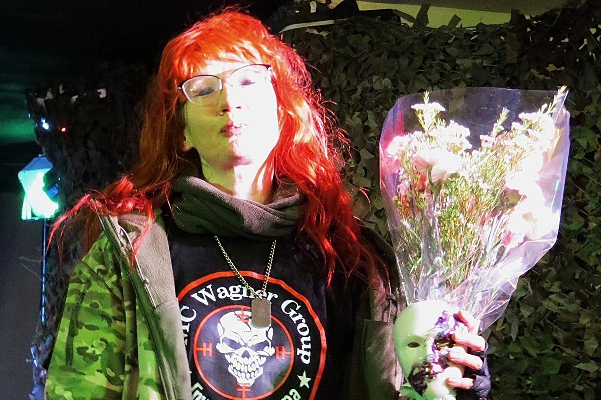 44-летняя Евгения Бильченко в камуфляжных штанах и худи ЧВК «Вагнер» высоким голосом декламирует стихи со сцены про «лям», яростно жестикулируя: