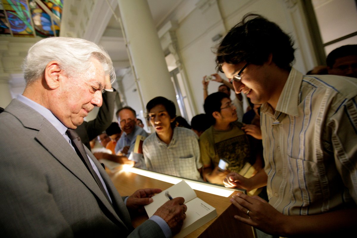 Марио Варгас Льоса даёт автограф на экземпляре одной из своих книг во время визита в библиотеку, названную в его честь, на территории бывшего железнодорожного вокзала в Лиме, Перу, 24 февраля 2010 года. Фото: Mariana Bazo / Reuters / Scanpix / LETA