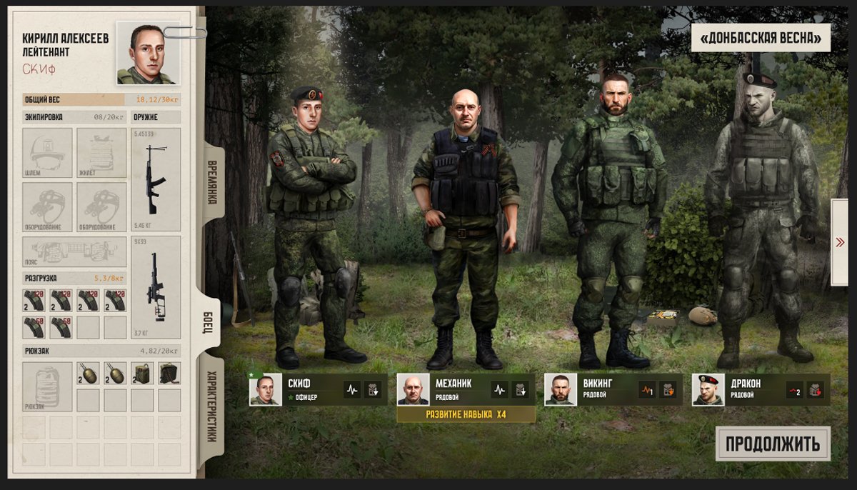 В мариупольской кампании на выбор — 6 персонажей с позывными «Скиф», «Викинг», «Дракон», «Волк», «Добрыня» и «Ирландец». Два с военным опытом, один — бывший полицейский (который до перехода на службу выживал и в тайге, и на неспокойных городских улицах) и два, видимо, бывших гражданских. Например, про «Викинга» указано, что такой позывной — дань его предкам, поскольку семья у него из Старой Ладоги, «а там викинги жили испокон века». Сам он ходит с томиком «Старшей Эдды» и умеет метать топор. Тема ролевиков-неоязычников раскрыта, а вот «скрепно»-православных героев создатели решили не включать.