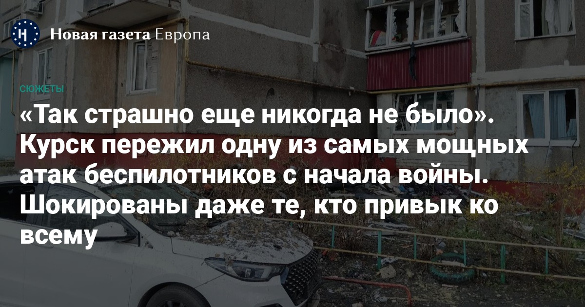 ВРИО губернатора Александр Хинштейн назвал случившиеся «беспрецедентным по жесткости преступлением украинских нацистов». Как сообщил чиновник, в больнице остаются четыре человека, одна из жертв в тяжелом состоянии: «У нее 45% ожогов второй и третьей степени лица, туловища», сообщил он. Российские СМИ уже называют атаку самой массированной за последние восемь месяцев. «Новая газета Европа» рассказывает, как жители Курска пережили эту ночь.