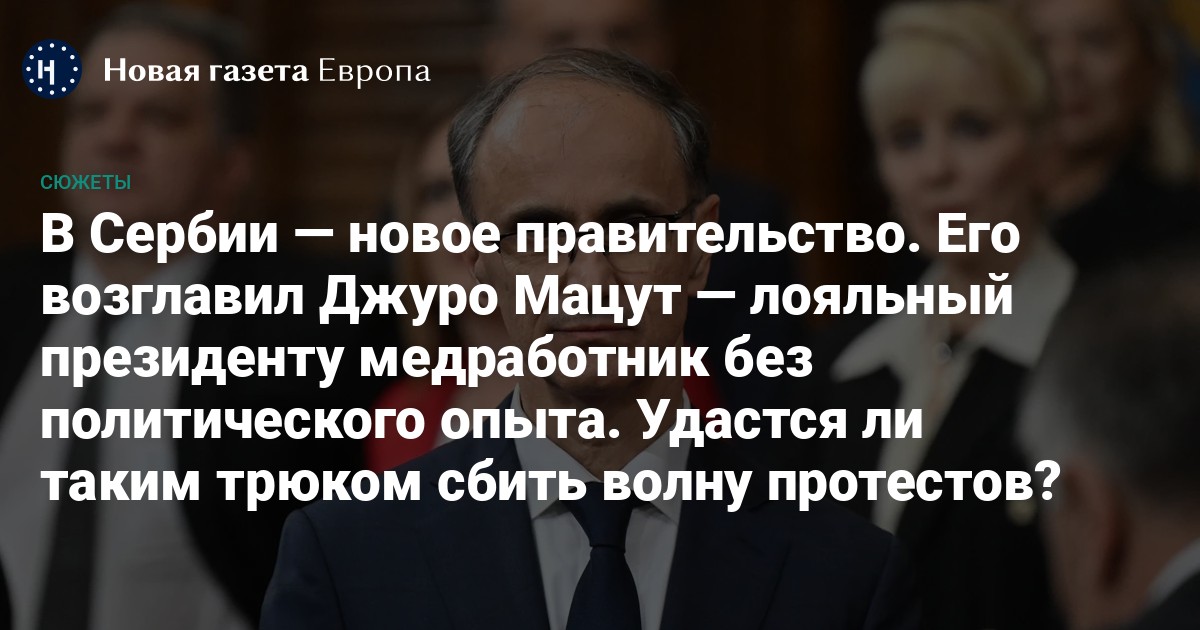 Тем не менее, в начале апреля Вучич неожиданно назначил профессора медицины Джуро Мацута новым премьер-министром страны. Мацут — уважаемый в сербском обществе врач, известный своей карьерой в области эндокринологии. Он с 2023 года открыто выступает с поддержкой действующей власти и лично Вучича, но значимые правительственные позиции до этого не занимал и в целом политикой не особо занимался.