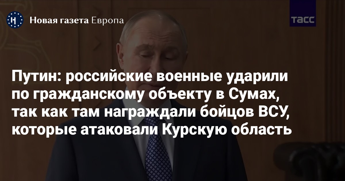 «Там проходило награждение тех, кто совершил преступления в Курской области и подразделений ВСУ, и националистов. И это те люди, которых мы считаем преступниками, которые должны получить заслуженное возмездие, за содеянное в приграничной области, в том числе Курской. Они и получили это возмездие. Это было сделано именно для того, чтобы их наказать», — сказал Путин.