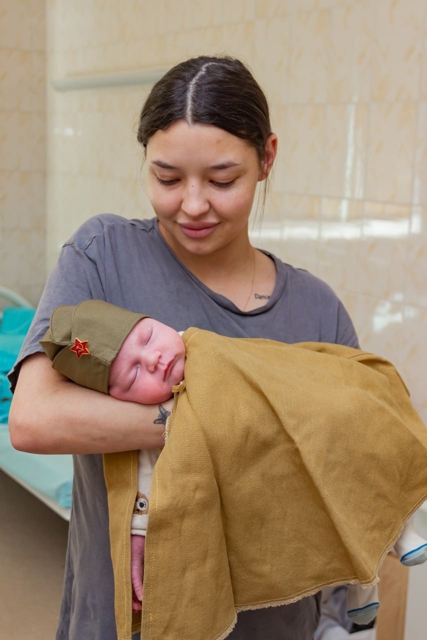 В роддоме подчеркнули, что акция приурочена к 80-летию победы в Великой Отечественной войне. На младенцев надевают пилотки и плащ-палатки, их шьют медсестры.