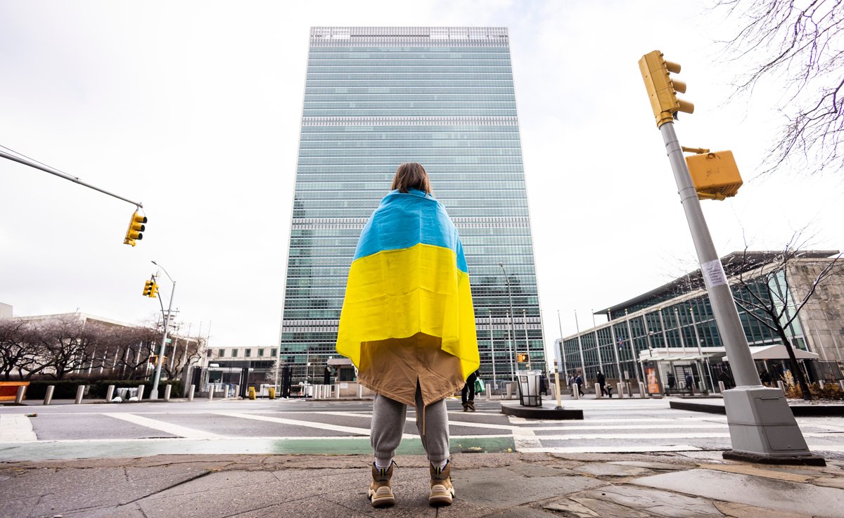 Женщина с украинским флагом стоит напротив штаб-квартиры ООН, Нью-Йорк, 25 февраля 2022 года. Фото: Justin Lane / EPA